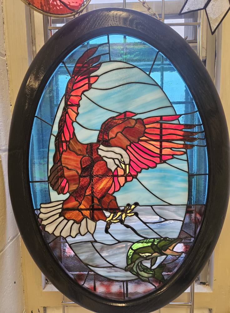 My primary inspiration is Nature in all its forms—from flora and fauna to dynamic landscapes. I am particularly drawn to the subtle beauty of changing seasons and the migration of local wildlife. I often seek to integrate this inspiration directly into my displays, frequently combining the vibrant stained glass pieces, such as birds or fish, with natural elements like found driftwood.”