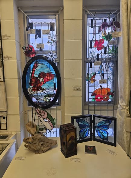 Our artist this month (December) is Joanna Babiak ! In her own words: “I specialize in creating stained glass art, utilizing the contemporary copper foil method (also known as the Tiffany method) rather than traditional lead came. This technique allows for greater precision, enabling me to execute more intricate designs and dimensional art pieces that go beyond flat panels.”