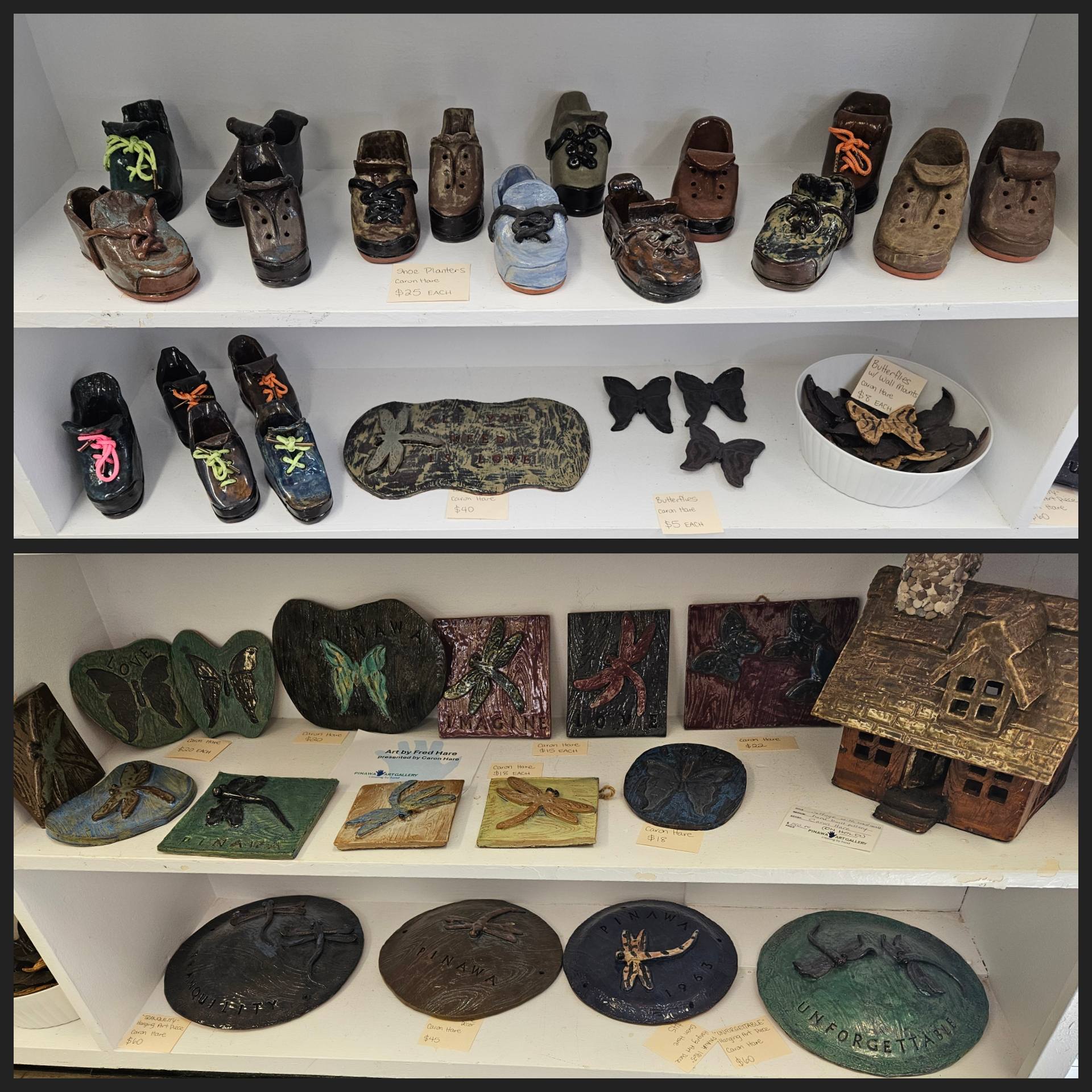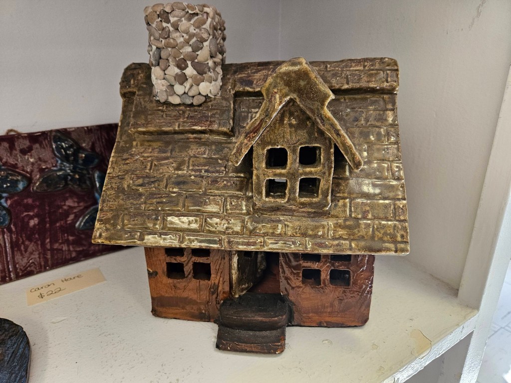 “My late husband Fred Hare.. He loved to build by hand his pottery houses, shoes, plates, dragonflies, butterflies etc. He was very creative and artistic. I am selling his remaining pottery through the art gallery and giving the gift of his beautiful work to be enjoyed by others. Fred and I both loved nature very much – going for long walks along the river, just soaking in the beauty surrounding us.